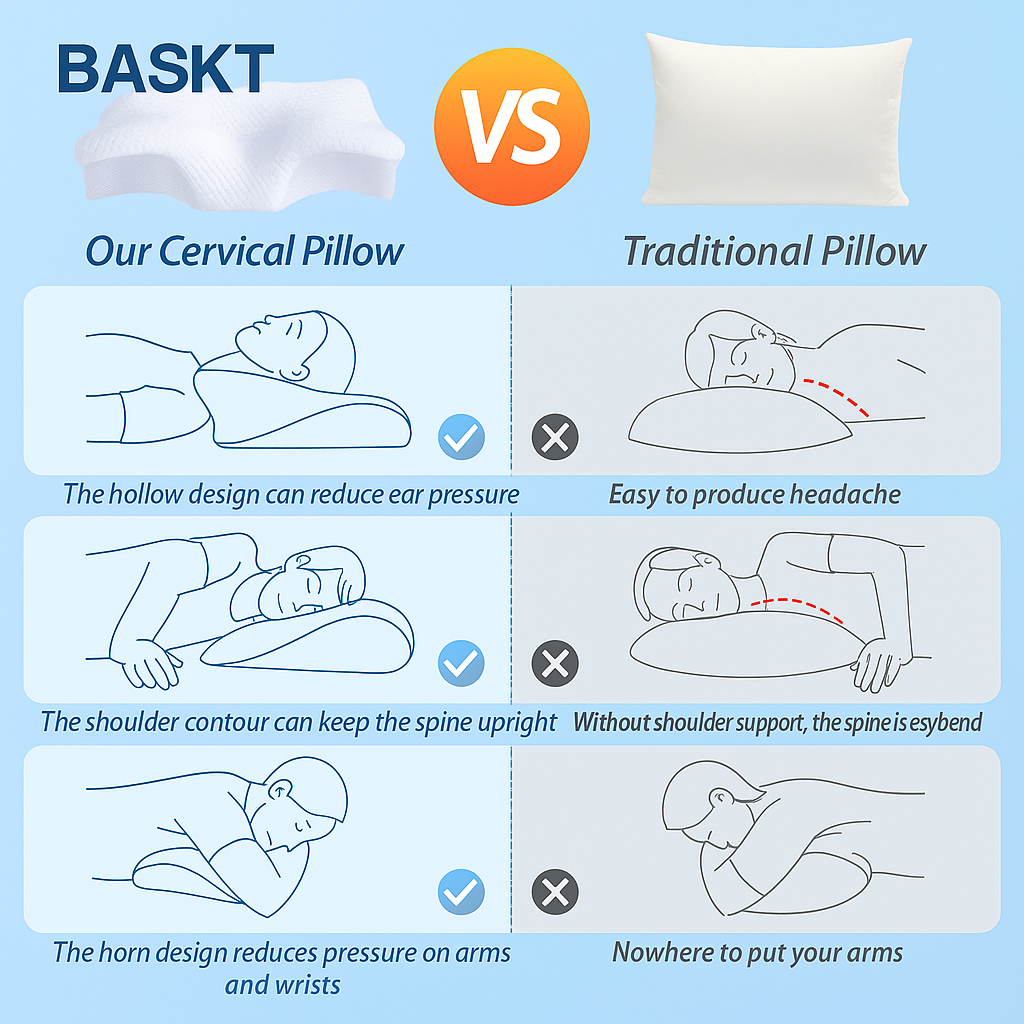 The BASKT pillow is ergonomically designed to support your neck’s natural curve, align your spine, and relieve pressure — reducing stiffness and discomfort.